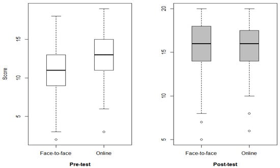 The initial level of knowledge of the students who took part in each teaching mode was assessed by comparing the results of the pre-test. Those who participated in the online learning mode scored higher than those from the face-to-face learning mode (ANOVA, F (177.1) = 11.36, p < 0.05). When comparing the results obtained in the post-test for both learning modes, no statistically significant differences were observed (H (1) = 0.319, p = 0.572; Figure 6).