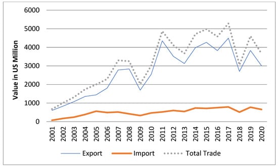 India’s Trade with Sri Lanka (2001–2020). Source: authors’ calculation based on data compiled from ITC, Geneva (https://www.trademap.org, accessed on 1 January 2022). Note: Data for the year 2018 were not available, so for the year 2018, the average of 2001–2020 was taken for the analysis.