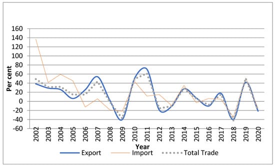 India’s Trade with Sri Lanka: Annual Growth Rate (2002–2020). Source: authors’ calculation based on data compiled from ITC, Geneva (https://www.trademap.org, accessed on 1 January 2022). Note: Data for the year 2018 were not available, so per cent for the year 2018 is based on the average of data of 2001–2020.
