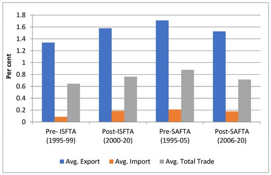 Subsequently, Khalid et al. [62] looked into the relationship between SAARC countries’ regional trade and the region’s food security issues. The paper econometrically analyzed the factors affecting the volume of food trade using data from Pakistan, India, Sri Lanka, and Bangladesh from 1990 to 2018. They point out that if resources are efficiently employed, the region’s (South Asia) higher consumption and greater import requirements can be met through adjacent trading partners. Their findings reveal that importing or exporting countries’ gross domestic product (GDP) and investment from abroad (FDI) have a positive impact on regional trade. However, the bilateral rate of exchange between trading partners has a detrimental impact on trade volume. Using Johansen’s cointegration test, their findings revealed that there was no long-run link between trade volume and food security. Khalid et al. [62] suggested that policymakers should concentrate on ways to improve the environment in Pakistan and India so that they can not only meet rising global food demand, but also increase their competitiveness in major export markets for both high-quality and low-quality priced goods. Pal and Pohit [63] sought to answer a key research question: why, even after a decade of implementation, do Indian exporters (13 percent) use the ISFTA route for trade far less than their Sri Lankan counterparts (65 percent)? Non-tariff barriers (NTBs), according to the authors, are being blamed in existing studies for impeding trade growth. Pal and Pohit [63] state that NTBs, on the other hand, have been classified as a sub-class of non-tariff measures (NTMs), which represent a more limited concept of discovering hidden impediments in the international trade process.