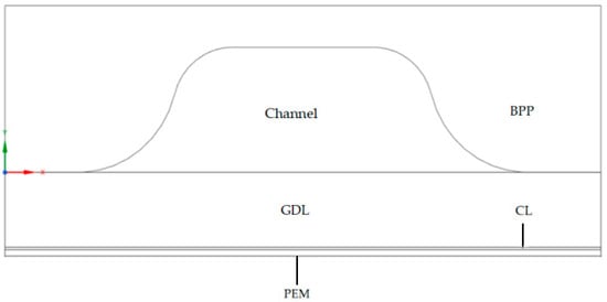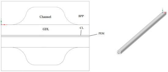 The PEMFC single-channel electrochemical performance model established in this paper is based on the actual PEMFC stack for the fuel cell vehicle with a hundred kilowatts, and the anode and cathode flow fields are parallel straight channel flow fields with symmetry. The structural dimensions of the single-channel model are shown in Figure 1, which consists of BPPs, GDLs, CLs, flow channels, and a PEM. The structural dimensional parameters of this model are shown in Table 1 and the material properties are shown in Table 2.