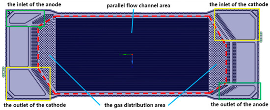 The established gas distribution model of a single cell refers to the actual structure of BPPs in the PEMFC stack, as shown in Figure 5. The marked dotted area of a circle is the simulation area of the single-cell gas distribution model, which mainly includes the gas distribution area in the inlet, the middle parallel flow channel area, and the gas distribution area in the outlet. The marked area of a rectangle is the shape of the anode manifold corresponding to the inlet and outlet of the anode gas. The marked part of the square is the shape of the cathode manifold corresponding to the outlet and inlet of the cathode gas.