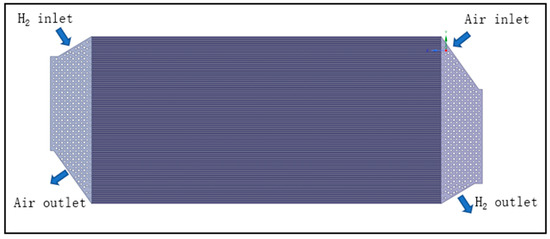 According to Figure 5, a three-dimensional gas distribution model of a single cell is established as shown in Figure 6. The middle parallel flow field is composed of 80 straight channels and the area is 250 mm × 120 mm. At the same time, to present the gas distribution consistency under the action of clamping force, the compressed cross-section shape of GDL is implanted in each straight channel of the single cell.