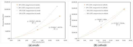 The application area of the porous media model is each straight channel in the single-cell simulation model. To accurately represent the flow field characteristics of PEMFC considering mass and heat transfer, chemical reactions, and other factors during actual operation, it is essential to validate parameter fitting based on the results of the single channel model under various clamping forces. When the compression of GDL is 10% and 20% respectively, different pressure and flow rates for the anode and cathode are fitted as the results shown in Figure 7. The calculation results of the inertial resistance coefficient and the viscous resistance coefficient are shown in Table 4.