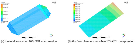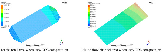 Similarly, the flow velocity of gas distribution in the cathode flow field under 10% and 20% of GDL compression at 2 A/cm2 can be obtained, as shown in Figure 11. Different from the anode flow field, it is evident that the flow velocity is faster in the channel near the cathode inlet in the cathode flow field.