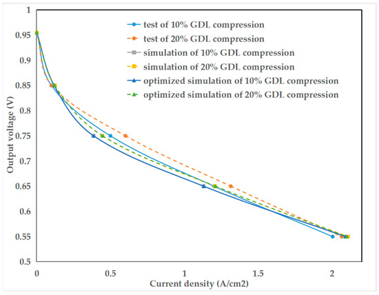 The polarization curve of the PEMFC stack can be obtained by experiments. In this case, the clamping force is calculated based on the compression of GDL, the voltage is the average voltage of all single cells, and the current density is the ratio of the current to the action area. Under 10% and 20% GDL compressions, the polarization curve of the single channel model, the optimized model, and the experimental results are individually shown in Figure 14. It is evident that with an increase in clamping force, all three polarization curves exhibit a slight improvement, suggesting that a moderate increase in clamping force can enhance the output performance of PEMFC.