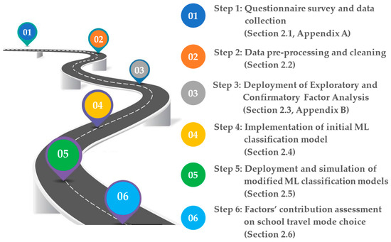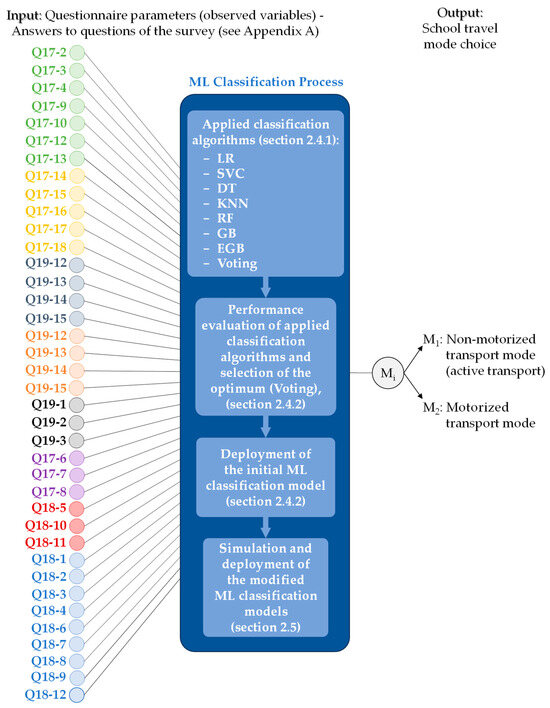 - Capitalization of research findings from EFA and CFA outcomes from previous research works (by some of the authors of the present paper), with a specific focus on the derived grouped parameters (labeled factors) that exhibiting homogeneous characteristics and interpretive properties in the school travel mode choice process, and aligning these findings with the research scope outlined in (c) to employ ML classification techniques.