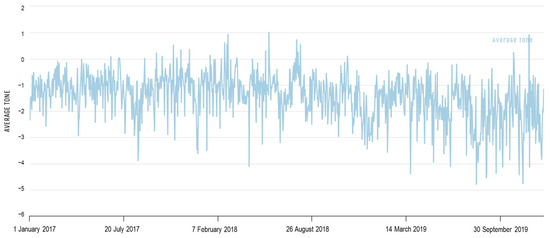 We extracted tone of media coverage data from the Global Database of Events Language and Tone (GDELT), a project that monitors global news coverage and provides more than 200 million geolocated events with global coverage from 1979 to the present [37]. The database has been used in previous research on public sentiment [34,38], peace [39], social unrest [40,41], and political violence [42]. We utilized the GDELT Summary tool launched in 2017 to extract daily average tones for China in individual African countries directly. GDELT Summary is based on GDELT 2.0 APIs and provides the volume and tone of any keywords across the world’s news media. While its advantage is to specify any keyword, data earlier than 2017 are lacking.