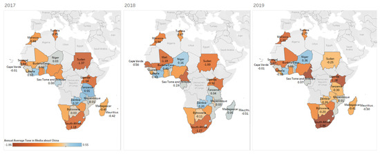 We extracted the daily tone of the media coverage of “China” in 32 African countries (a full list is supplied in Appendix A) from 2017 to 2019 and used the annual average tone of media coverage (Figure 2) to measure public perception of China (pp_China).