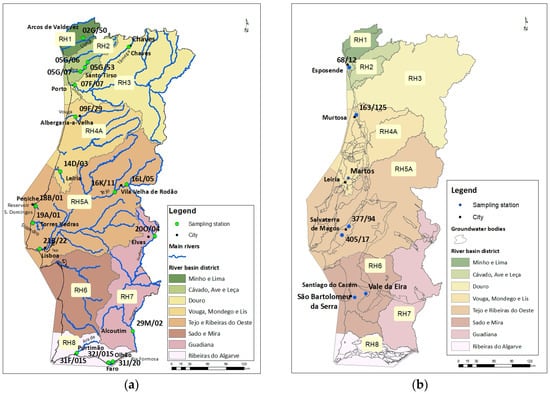 (a) Surface water sampling stations (adapted from Viana et al., 2021 [21]); (b) groundwater sampling stations. Maps provided by the Portuguese Environmental Agency. RH: River basin district.
