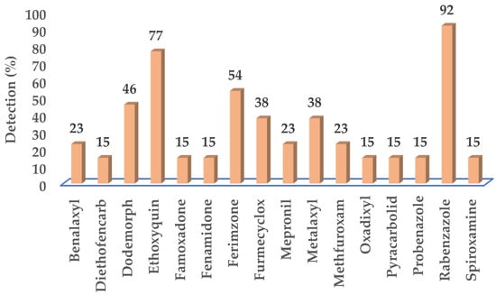 Considering the primary mode of action classes, the sterol biosynthesis inhibitors, including the amines or morpholines group (Δ14 reductase and Δ8 → Δ7 isomerase inhibitors) and the well-known DMIs (demethylase inhibitors), were the most representative of the detected fungicides with seven compounds, followed by the quinone outside inhibitors (QoI) and beta-tubulin inhibitors, each one with five substances as well as mitochondrial succinate dehydrogenase inhibitors (SDHI) with three substances (Table S1).