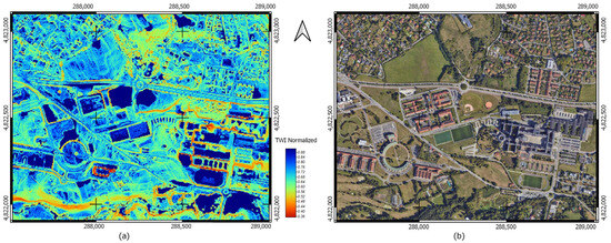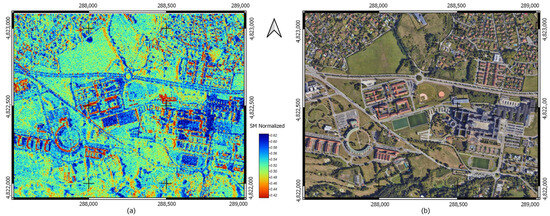 (a) The normalized SM values for the case study; (b) the most recent orthophoto available from the National Aerial Orthophotography Plan of the National Geographic Institute of Spain.