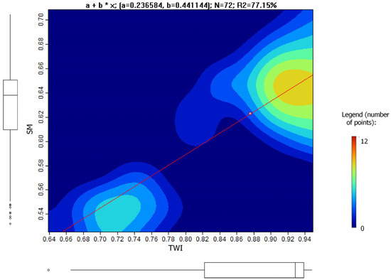 The selection of 72 points from within these plots was conducted through random sampling. These points were used to determine the normalized SM and TWI values.