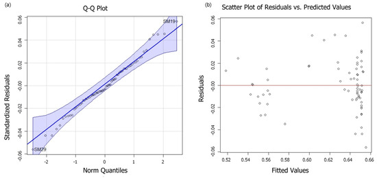 In the context of linear regression, ensuring the accuracy and dependability of analysis results hinges upon the adherence to two pivotal assumptions: homoscedasticity and the normal distribution of residuals. Normality evaluation refers to the assumption that the errors are distributed according to a Gaussian distribution, and homoscedasticity refers to the assumption that the variance of the errors is constant. These assumptions were subjected to validation through the Kolmogorov–Smirnov and Breusch–Pagan tests, respectively. The linear model demonstrated conformity to both assumptions, as evidenced by p-values exceeding 0.05. The results of the normality test are graphically depicted in Figure 6, along with a scatter plot of residuals and predicted values.