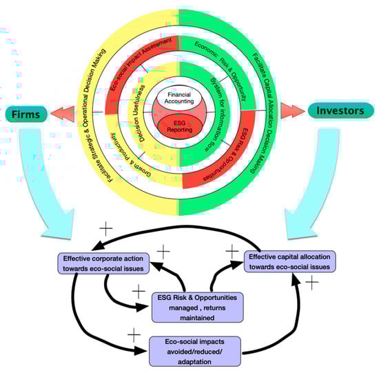 Investors use ESG reporting to make effective capital allocation decisions, while firms use it to gain information about effective sustainability risks, opportunities, and management control [15,16]. These goals manifest in a positive feedback loop (Figure 1) and are expected to lead to a sustainable form of capitalism over time [17]. This implies that the flow of money from investors can allow entities to innovate for growth and productivity (with risks and opportunities managed) without negatively affecting people and the planet. With various investment-screening mechanisms enacted on a large scale, only entities that are closely aligned with the sustainable development agenda will be allowed to grow. When implemented transparently, this scenario encourages stakeholders, including consumers and governments, to influence entities’ actions. Thus, the desired positive outcomes can be achieved by controlling for corporate impact. This is referred to as the “ESG dream”. Unfortunately, such outcomes have not been realized, and the impact of ESG measurement and reporting has been oversold [17].