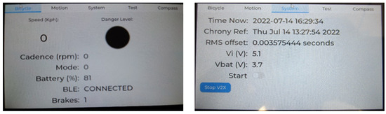 Furthermore, the cycle was also equipped with a touch LCD display, where the cyclist was informed about sensor outputs (positioning, speed, heading, battery status). Using this human–machine interaction (HMI) element, the user could also interact with the device, by starting and stopping on-demand its operation, for better control over the experiments. There were also visuals on the screen that presented collision warnings (Figure 1) and were accompanied with an acoustic buzzer sound in the case of a collision detection, so that the cyclist could become aware of potentially dangerous situations as fast as possible after the detection from the system, without having to keep his gaze constantly on the screen, in order to take avoiding action.