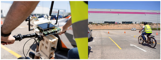 To fully exploit the enhancements on the cycle and evaluate the actual performance of the developed system, realistic riding behavior from a real cyclist on a cycle, who could react to warnings as a human would, was deemed necessary. The physical testing was conducted with 12 volunteers at an IDIADA proving ground in Santa Oliva, Spain. The testing scenarios were based on the findings of the accidentology study conducted in [1] and characterized within [16] to fit Euro NCAP testing protocols and physical testing requirements. For safety reasons, using a real vehicle in scenarios with a high probability of collision between the vehicle and a real cyclist was not feasible. Therefore, a virtual vehicle was used instead. The term “virtual vehicle” refers to a V2X device station that transmitted a pre-recorded series of CAM messages, precisely corresponding to the vehicle’s path, speed, and direction for the scenario being tested in each run. With this strategy, in the V2X ecosystem, the vehicle was “present” without posing any collision safety risks during the experiments. The volunteers riding the cycle were instructed to follow predefined paths and speeds that corresponded to the chosen scenario being tested each time. Figure 2 shows the setup of the physical testing environment.