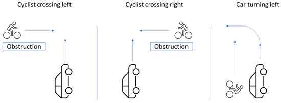 The evaluation scope was the potential benefit assessment of a V2X-capable cycle on-board unit triggering a warning signal to the cyclist in a potential collision scenario, which represented crossing right, crossing left, and car turning left with cyclist in same direction scenes (Figure 3). These scenes have been defined in “Safe-Up” project [1] since they represent a majority of crash scenes in accident databases and additionally are not yet fully covered by EuroNCAP.