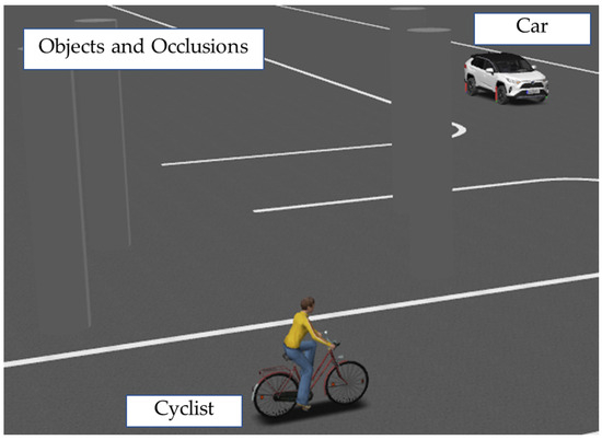 Based on GIDAS-PCM data, 1345 reconstructed real-world accidents were prepared for a simulation in IPG CarMaker “version 10.2”. These scenarios consist of two traffic participants and reconstructed objects/occlusions; see Figure 4.