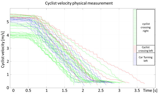 Figure 5 shows all cyclists’ velocities over time in the three assessed scenarios. The reaction was similar in all scenes to the warning trigger. The horizontal part of the curves represents the reaction time to the warning trigger, whereas the pitched part represents the continuous braking and thus constant deceleration of the cyclist to a standstill.