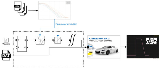 Based on these results, a functional mock-up unit (FMU) can be created, which is then deployed in the virtual simulation, see Figure 6. The unit works the way that the initial path of the cyclist is followed in the beginning of the simulation. As soon as the warning trigger is sent, the cyclist will react and overrule the given trajectory with the defined behavior.
