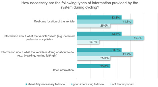 With regards to the relevance of the type of information that the system can provide to the cyclists while they are cycling in an urban area, the majority of the volunteers indicated that real-time information on vehicle location, what the vehicle detects, and what it is doing or about to do, is either necessary or good to know, as shown in Figure 8. Only a small percentage of respondents believed that such information is not as crucial. Three volunteers mentioned other types of information that they consider vital for cyclists, such as information related to crash avoidance and the provision of information via acoustic messages instead of visual information.