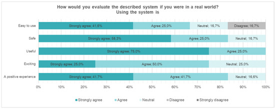 The next question addressed to the volunteers pertained to the evaluation of the system’s usage in a real-world environment, focused on aspects such as ease of use, safety, usefulness, excitement, and overall user experience. Based on the findings depicted in Figure 9 below, we can draw the conclusion that the majority of the volunteers agreed that if the system was operational in a real-world context, it would be easy to use, safe, useful, pleasant, and a positive experience for the cyclist. Nevertheless, it is worth noting that two respondents expressed the belief that the system usage might be too complex in a realistic urban context.
