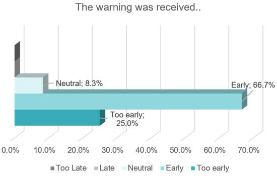 Concerning the timing of the warnings triggered by the system, the volunteers indicated that during the testing phase, the warnings were provided relatively early, as depicted in Figure 10. This observation was also confirmed in the virtual simulations and is further elaborated upon in the Discussion section.