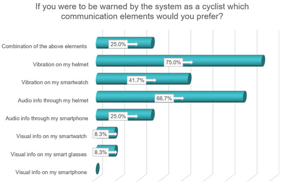 Based on the results summarized in Figure 11 below, it can be concluded that elements integrated into the cyclist’s helmet, such as vibration (9 out of 12 volunteers) and audio (8 out of 12 volunteers) were the most popular amongst the volunteers. Vibration on the cyclist’s smartwatch was selected by 5 volunteers, while audio on the smartphone (3 out of 12 volunteers) and visual information (2 out of 12 volunteers) attracted less popularity. It is also worth noting that three volunteers proposed combinations of elements that include: (a) audio and vibration on both the smartphone and smartwatch) and (b) auditory communication on the helmet and vibration on the smartwatch.