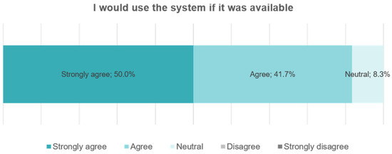 Furthermore, the volunteers’ attitude toward their willingness to use such a system if it were available in the market was assessed. In total, as shown in Figure 12, 11 volunteers indicated that they would be willing to use the system if it became available, while one volunteer had a neutral opinion.