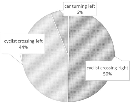 Overall, 1345 PCM cases were simulated in IPG Carmaker. All scenarios led to a crash between cyclist and passenger car. Figure 13 shows the distribution of the assessed crash scenarios. In total, 6% have been car turning left cases, 44% cyclist crossing left, and 50% cyclist crossing right cases. The scenarios also included occlusion elements, which reduce visibility between cyclist and passenger car (sight obstructions).