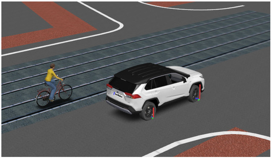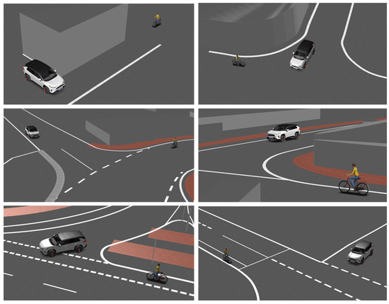 From 1345 crash cases, there were 24 remaining collisions for the “progressive” and 25 crash cases for the “defensive” cyclist behavior model. In all other simulation cases, the warning trigger led to a cyclist being able to stop in time before a collision occurred. Figure 14 shows an overview of exemplary simulation cases, where the cyclist was able to stop in time and prevent a collision with the passenger car. The remaining distance to the vehicle mainly depended on the type of braking profile of the cyclist—which is, in these cases, a progressive profile. This warning trigger was based on a time to collision (TTC) prediction between cyclist and vehicle; with higher velocities of cyclist and vehicle, the remaining distance between the two opponents increased (see middle left picture).