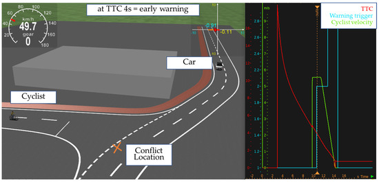 The defined trigger time of 4 s seems to be too early for some of the simulations as can be seen in Figure 16. In this scenario setting, where there are just 2 traffic participants, the distance to the conflict location is 20 m for the cyclist and 55 m for the car. It is, therefore, difficult for the cyclist to associate the vehicle as a conflict partner with the trigger signal. Furthermore, in more complex traffic situations, the allocation of the corresponding traffic object will be more difficult, even for a human being. This corresponds to the findings of the physical trail, see Figure 10. Thus, further research and assessment on early warnings is needed.