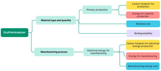 Analyzing this process from a sustainability point of view can be challenging, due to the numerous variables and consequences to take into account. The EcoPrintAnalyzer will focus on two main aspects to evaluate the environmental consequences of the manufacturing: the feedstock material and the 3D printer used in the process. It will provide insights about the carbon dioxide equivalent (CO2e) emissions end the energy consumption due to the process, an estimate of the production costs, and notes about the biodegradability of the final part. The diagram shown in Figure 2 presents the data flow used for the tool.