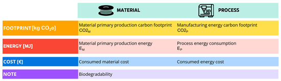 The EcoPrintAnalyzer plugin classifies insights about the carbon footprint, energy consumption, costs, and biodegradability with respect to the material and the AM process, as shown in Figure 4.