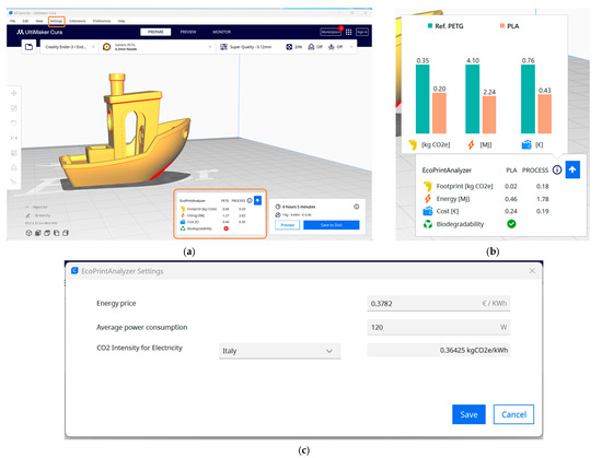 The EcoPrintAnalyzer incorporates a setting interface, delineated in Figure 5c, wherein, upon selecting the country, users access estimated values for energy pricing and the CI factor. This window also permits manual input for the average power consumption of the 3D printer, along with the aforementioned values if more precise data are available. All the data entered can be stored and retrieved for each defined printer within Cura. Information concerning material unit prices is stored in a separate setting already integrated into Cura’s interface. After the slicing process, the EcoPrintAnalyzer gathers the type and quantity (m) of the utilized material, the printing settings (TE, TB), and time (t). Then, it outputs a graphical panel in which the environmental insights are presented according to the scheme in Figure 4.