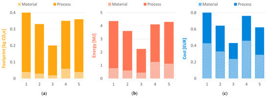 Bar charts summarizing the environmental effects of additively manufacturing the five case studies grouped in equivalent carbon dioxide footprint (a), energy consumption (b), and cost (c). Each bar is subdivided into the two main aspects considered by the EcoPrintAnalyzer: material and process.