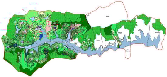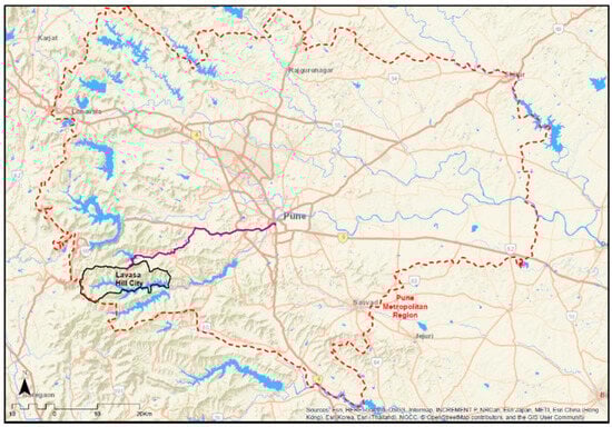 Lavasa is a privately owned hill city developed in the hills and forest areas (spread over 100 km2 area) around the backwaters of Baji Pasalkar Lake (also known as Varasgaon Lake) in the Western ghats (Sahyadri ranges) about 60 km southwest of Pune. It occupies a peripheral location within the boundary of the PMR. As a multifaceted development, it has been described in many ways—private city, new town, hill city, eco-city, new urbanism, lake city, tourist city, and township [50,51,52,53]. The multiple meanings and imaginations result partly from the confusing ways in which Lavasa has represented and marketed itself, partly due to its legislative status [54], and partly due to scholars who critiqued certain aspects of this town [52]. It was established under the state government’s “Hill station policy’” (notification No. TPS. 1896/1231/CR-123/96/UD-13, dated 3 September 1996), which meant that sustainable tourism would be its main activity. However, subsequently, using other regulatory instruments, this primary use was altered to widen the economic base to include the education, hospitality, and leisure industry to favour its development goals. The master plan of Lavasa covers an area of 40.5 km2 including nine villages that received approval from the revenue collector of Pune under the regulation of regional plan 1997 and Hill Station Regulations 1997. In 2000, Lavasa Hill Station received “in-principle” approval from the state government enabling the company to get benefits under the industrial policy (that included the purchase of agricultural land beyond the legal ceiling of 22 ha). Over the years, the area under Lavasa expanded and in 2008, a Special Planning Authority status was conferred to Lavasa to perform the planning and regulatory functions of the government. Figure 2 shows the layout of Lavasa.