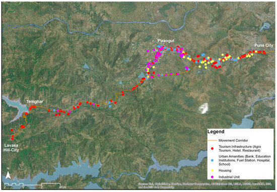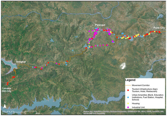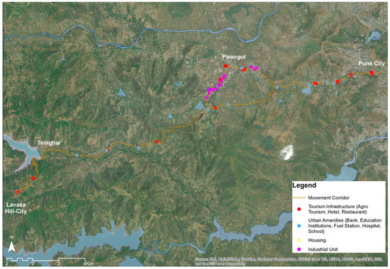 The access road from Pune city was upgraded in segments; the Pune to Pirangut (26 km) segment was completed first. Pirangut was a rural town with few industrial units and was often imagined at the boundary of the Pune urban area. With the new road providing better connectivity, industrial activities proliferated in the case of the Industry–Tourism–Urbanisation nexus [59]. Existing industrial units began to expand, and newer units started operating with the intention of export-oriented industrial production. The movement of industrial workers triggered housing demand. Being a rural town, the formal housing supply was limited and hence, villagers began to invest in informal labour accommodations. Most of the new constructions were concentrated along the road. The informal weekly bazaar flourished as the road brought more customers. Many small shops, shanties, and street vendors began to appear on the road to sell farm produce from the nearby rural settlements. The weekly bazaar became a permanent fixture and soon transformed into a somewhat semi-formal marketplace. Many industrial units began to build roads to provide last-mile connectivity from the upgraded road and allowed deeper accessibility into the surrounding areas through stray dead-end roads. Figure 3 marks many of these developments.