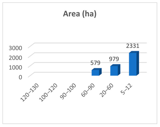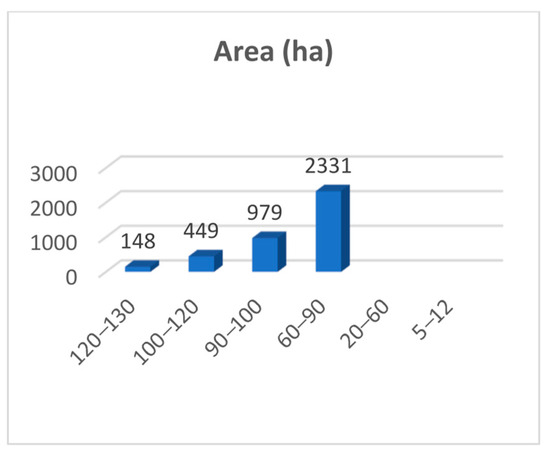 According to SubFIPI’s 2005 report, the total remaining peat area in U MT National Park is 3907 hectares. This area is further divided into four categories based on the depth of the peat layer: the area with a peat layer depth between 120 and 130 cm is 148 hectares, the area with a depth between 100 cm and 120 cm is 449 hectares, the area with a depth between 70 and 100 cm is 979 hectares, and the area with a depth between 30 cm and 70 cm is 2331 hectares, as shown in (Figure 5). To explain this statement, it provides information about the remaining peat area in U MT National Park and how it is distributed based on the depth of the peat layer. Peat is a type of soil formed from the accumulation of partially decayed organic matter, typically found in wetlands. The depth of the peat layer can be an essential factor in determining the quality and productivity of the soil. The statement informs us that there are four categories of peat layer depth in the remaining peat area of U MT National Park: 120–130 cm, 100–120 cm, 70–100 cm, and 30–70 cm. The largest area of remaining peat is in the category with a depth of 30–70 cm, which covers 2331 hectares. The next largest area is in the 70–100 cm depth category, which covers 979 hectares. The smallest area is in the category with a 120–130 cm depth, which covers only 148 hectares. Overall, the statement provides essential information about the distribution of the remaining peat in U MT National Park, which could be helpful for researchers, policymakers, and conservationists interested in understanding this unique ecosystem’s ecology and potential uses.