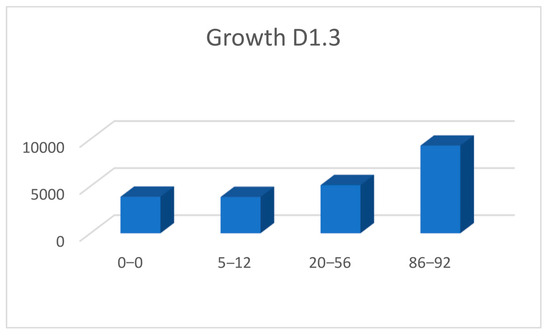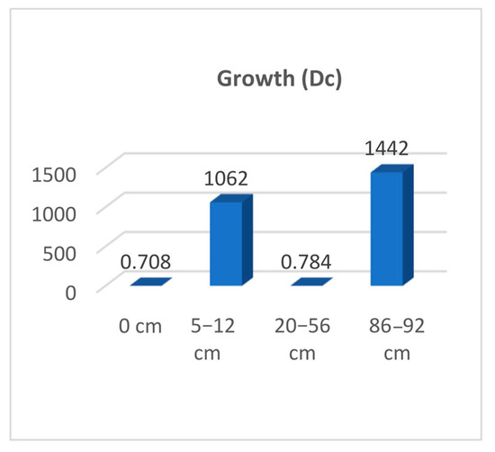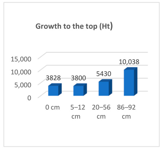 Growth of trunk diameter at 1.3 m by peat thickness (2003–2021). The development of the plants was measured concerning the thickness of the peat layer (UMTNP, 2022) [24]. The results are presented in Table 8 and Figure 7, where it can be seen that the growth was 3.87 cm when there was no peat layer (control). When comparing the control to peat thicknesses ranging from 20–56 cm, the change was 1.3 times higher, with measurements of 3.88 cm and 5.12 cm, respectively. Similarly, comparing the control to peat thicknesses of 86–92 cm, the growth was 2.4 times higher with measurements of 3.88 cm and 9.32 cm, respectively. The difference in terms of peat thickness was found to be significant (p < 0.001), as shown in Figure 7.