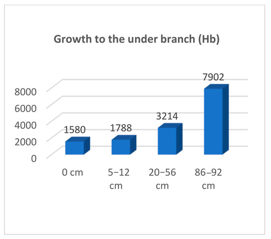 Height growth under branches (Hb) by peat thickness (2003–2021). The height growth under the branches of the Melaleuca trees also varied significantly based on peat thickness, as shown in Table 9 and Figure 9. In areas with no peat, the growth was 1.58 m, and with a peat thickness of 5–12 cm, the growth was slightly higher at 1.79 m, but the difference was insignificant. However, when the peat thickness increased to 20–56 cm, the height growth more than doubled to 3.21 m, and the difference was significant compared to areas with no peat. Similarly, in regions with a peat thickness of 86–92 cm, the height growth increased significantly to 7.90 m, five times higher than in areas without peat. These results suggest that peat thickness significantly impacts the height growth of Melaleuca trees, with thicker peat layers leading to substantially greater height growths.