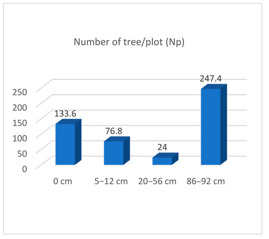 Number of trees in survey plot (N/p) based on peat thickness (2003–2021). In (Figure 11) The control peat thickness of 0 cm consisted of 134 tree/500 m2, peat thickness ranging from 5 cm to 12 cm consisted of 77 tree/500 m2, peat thickness ranging from 20 cm to 56 cm consisted of 24 tree/500 m2, and peat thickness ranging from 86 cm to 92 cm consisted of 247 tree/500 m2. Comparing the 0 cm control thickness and thickness ranging from 86 cm to 92 cm with 134 tree/500 m2 and 247 tree/500 m2, respectively, the latter is 1.8 times higher, which is a significant difference with a significance level p < 0.001.