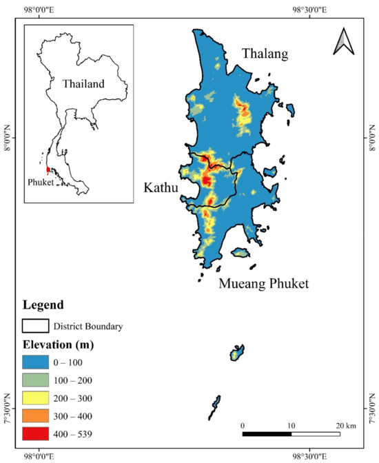 Phuket is a province in Thailand; it is also the name of the largest island in the country. It is situated in the upper southern region of Thailand, positioned between latitude 7°45′ to 8°15′ N and longitude 98°15′ to 98°40′ E (Figure 1). It comprises Phuket Island, along with an additional 32 smaller islands located along its coastline.