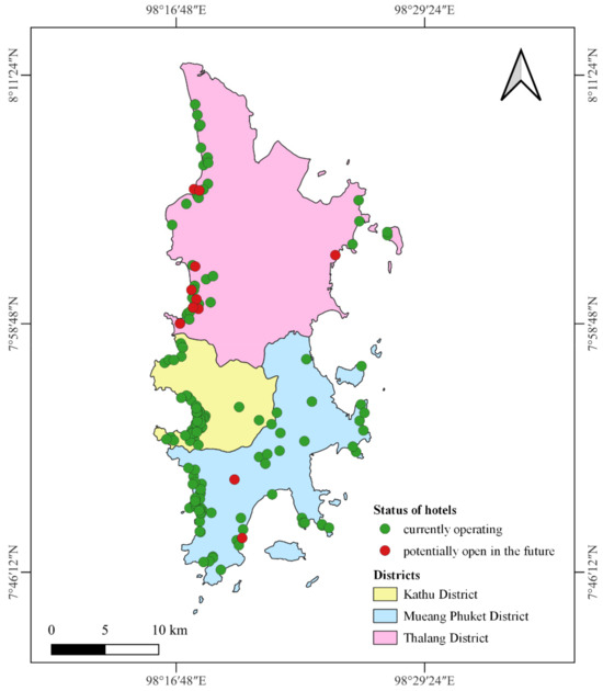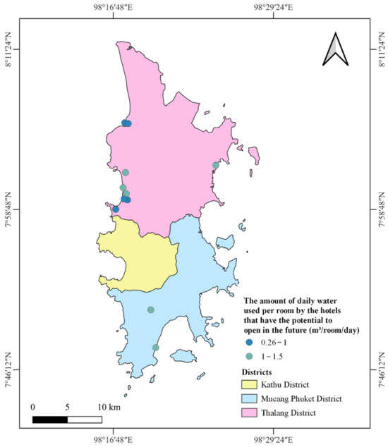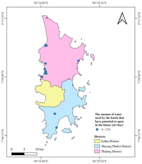 There are 12 EIA hotels with the potential to open for business in the future. They have a total water consumption of 474,814 m3/year, with the hotel’s water consumption being less than 250 m3/day (Figure 7). However, the majority of water usage is concentrated in Thalang District, and most of them are located in the same area as the operating EIA hotels with high water usage. If there is the development of water reservoirs, this area is also an option that should be considered in order to prevent long-distance transportation. Overall, the majority of the 178 hotels were concentrated in the western part of the province.