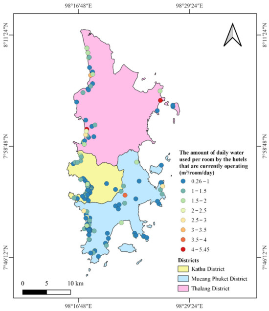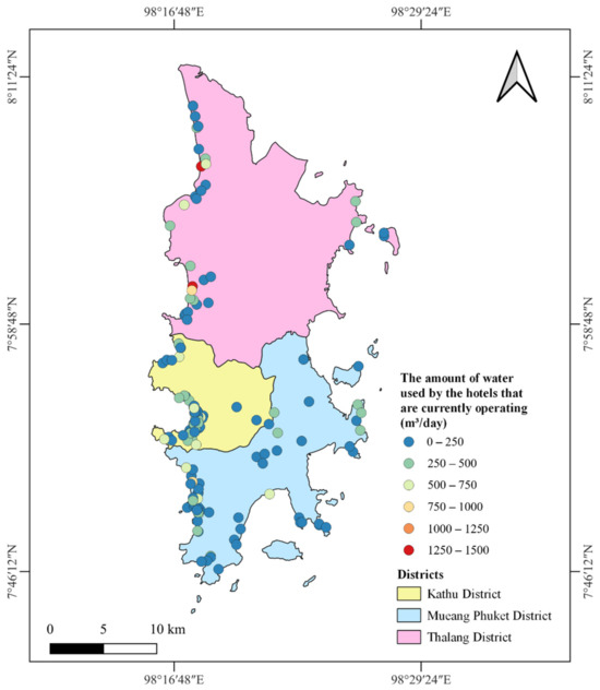 According to Figure 5, it was observed that the western part of Phuket experiences higher water consumption compared to other areas. This can be attributed to the hotels’ locations, given that most of the studied hotels were situated in the western part of the province. In the case of Mueang District, hotels are not only located in the western area but also sprawl across the entire district. Additionally, the map provides a breakdown of water consumption (m3/day), categorized into six ranges, as outlined in Table 5.