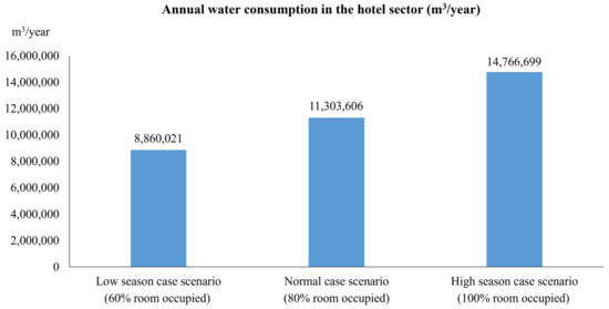 Annual water consumption has been simulated into three scenarios: the low season scenario (60% of occupancy), the normal case scenario, and the high season scenario (100% of occupancy). These percentages are also based on the occupancy rate reported in the research project for water management in Phuket Province [36]. The calculation of annual water consumption for the normal case was conducted based on the months of the high season (December to February) with an occupancy rate of 100%. Then, for the low season (May to September), the water consumption was calculated with an occupancy rate of 60%, and for the regular periods of March to April and October to November, the rate was set at 80%. These seasonal rates are cited from the study conducted by [15]. According to the study results of 178 hotels, water consumption of 8,860,021 m3/year, 11,303,606 m3/year, and 14,766,699 m3/year was found in the low season scenario, normal case scenario, and high season scenario, respectively (Figure 9).