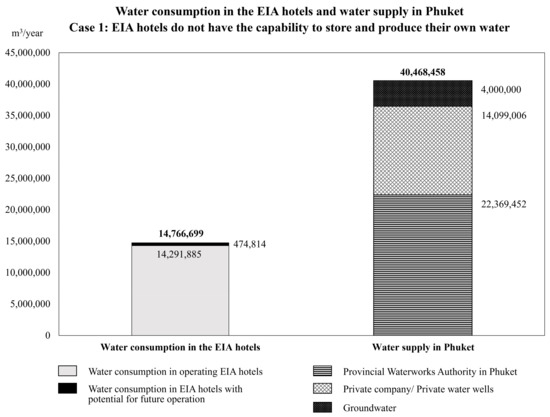 The amount of water used in the EIA hotels and the total water supply in Phuket in a scenario where EIA hotels do not have the capacity to store and produce their own water.