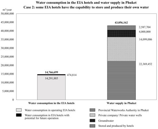Evaluation in the previous sections reveals that currently, Phuket Province still has a relatively high shortage of water. This section shows the significance of water storage and production by EIA hotels in Phuket Province themselves on the overall of the province. It can be divided into two cases: (1) EIA hotels do not have the capability to store and produce their own water, and (2) some EIA hotels have the capacity to store and produce their own water. A summary of the results from this study is given below.