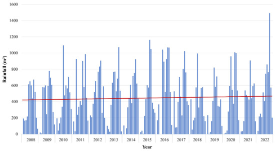 Currently, the issue of water scarcity in Phuket continues to be a pressing concern that requires immediate attention. The problem of water loss in waterworks production can be addressed in the short term, and relevant agencies should seek solutions to manage these issues and increase the water supply to the province. Additionally, there is a need to enhance the region’s capacity to harvest rainwater to meet the demands of all sectors. Rainfall data spanning the past 15 years (from 2008 to 2022) indicates a slightly continuous upward trend in rainfall, although precipitation levels may vary from month to month (Figure 12). Therefore, by identifying the primary challenge of water scarcity in Phuket Province, better management of available water resources should be achieved.